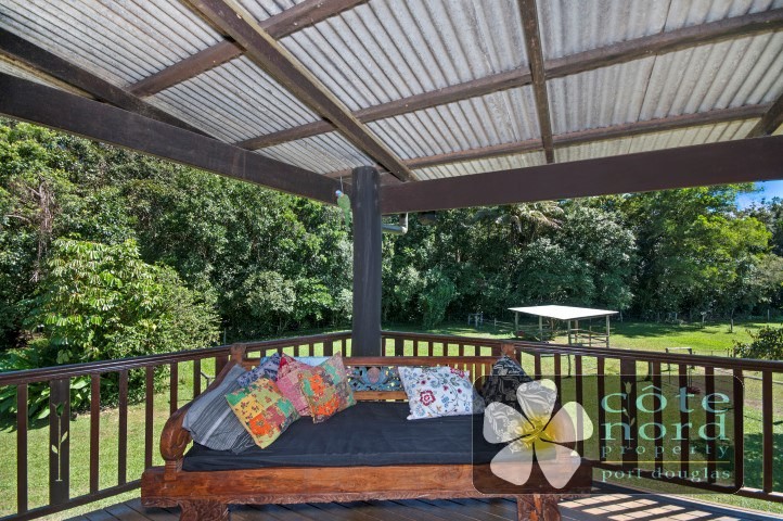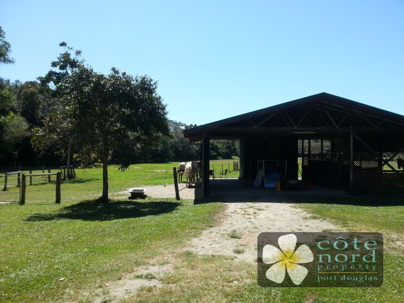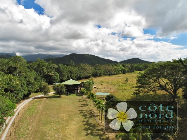 On well over 4 hectares, the property is fenced, and there are stables for horses, additional shelters in the paddocks, bore water, and tropical fruit trees. Rural in feel this property is only 15 minutes from the resort village of Port Douglas, and 10 minutes from Mossman, with its schools, golf course, supermarket, medical facilities,