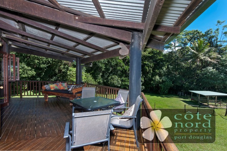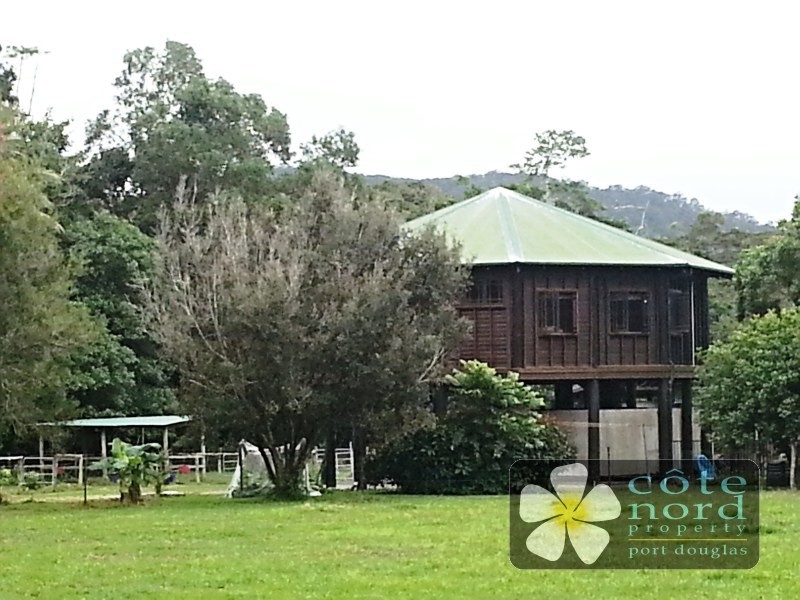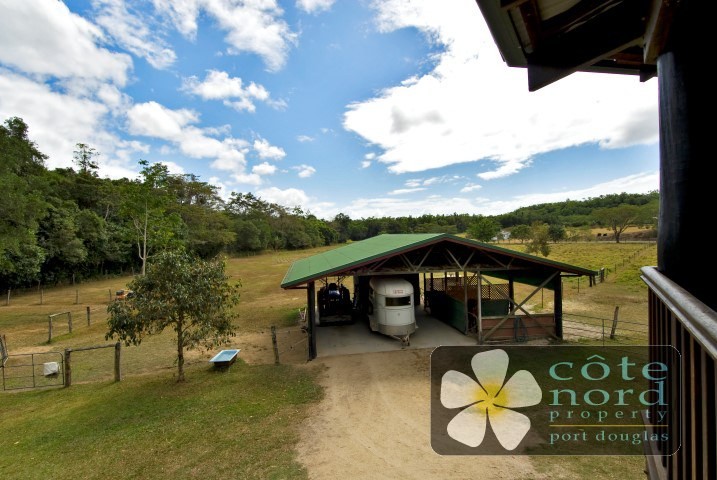 On well over 4 hectares, the property is fenced, and there are stables for horses, additional shelters in the paddocks, bore water, and tropical fruit trees. The sellers have had some cattle on the property, chickens, but although rural in feel, the property is only 15 minutes from the resort village of Port Douglas, and 10 minutes from Mossman, with its schools, golf course, supermarket, medical facilities,