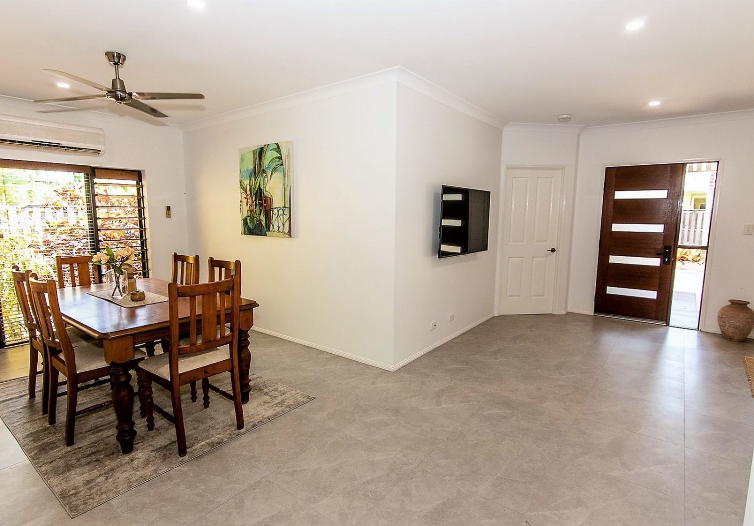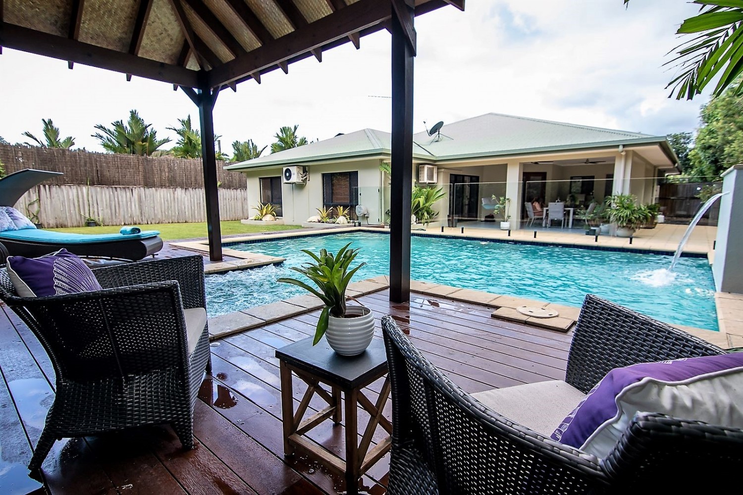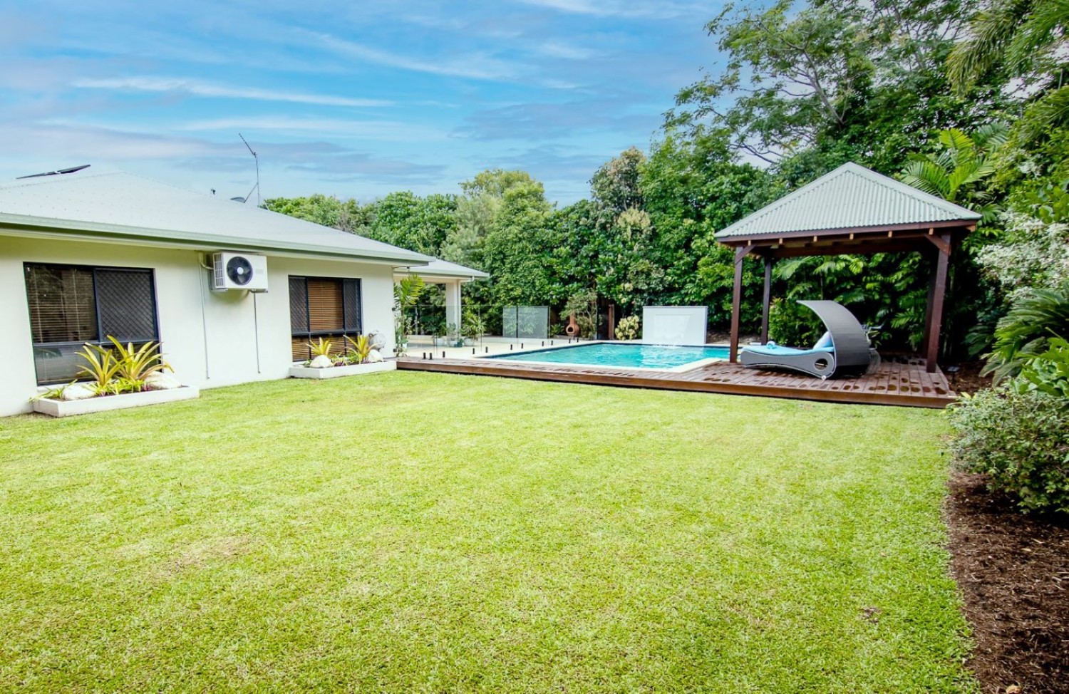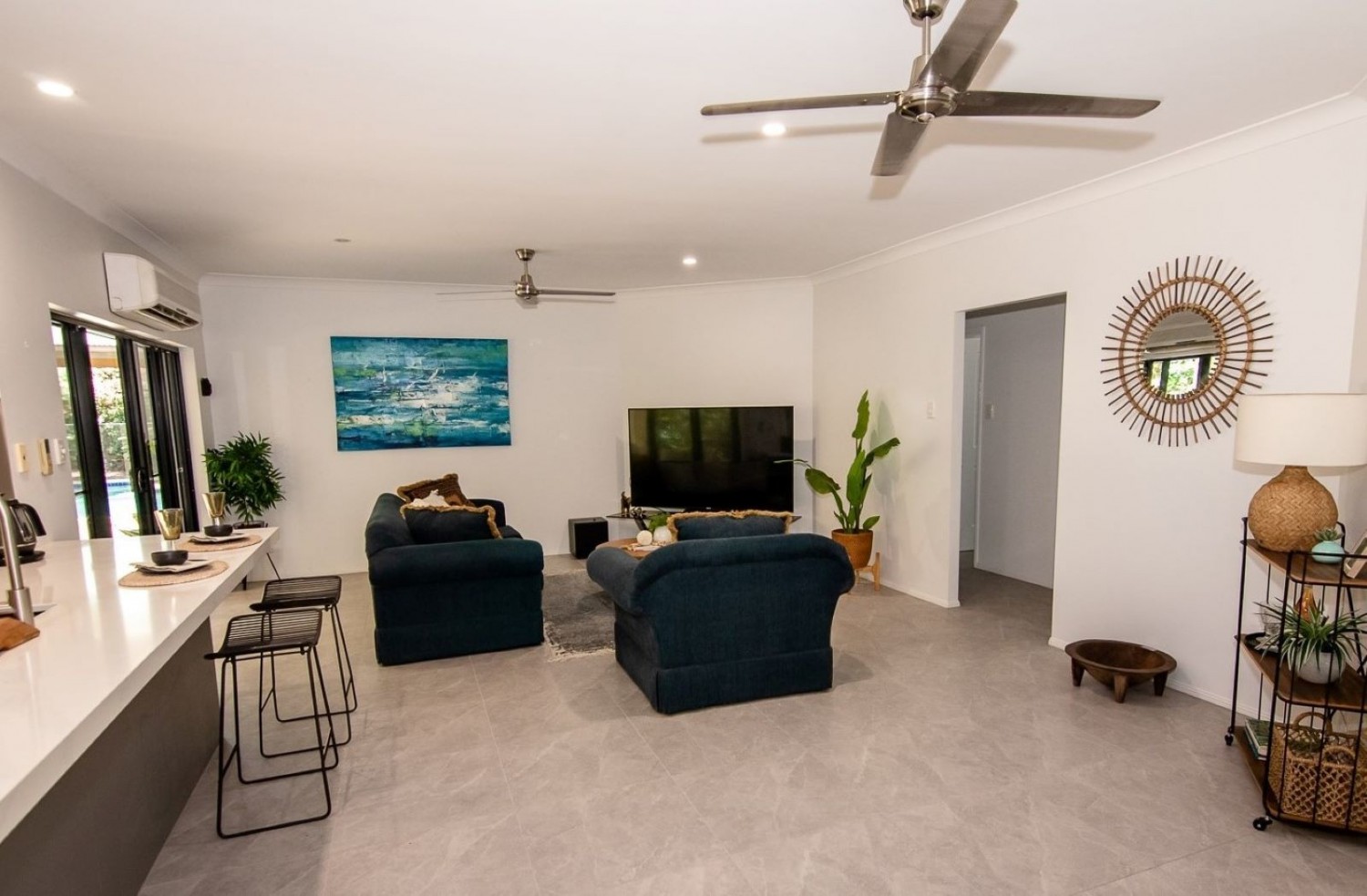 Discover this substantial and stylish Port Douglas home which benefits from a discreet and private location and a supersized residential block of land, well over 1,200m2. A foxtail palm lined driveway leads you to the fresh 4-bedroom 2-bathroom house with expansive indoor and outdoor entertaining areas, gorgeous swimming pool and backyard lawn for family fun.