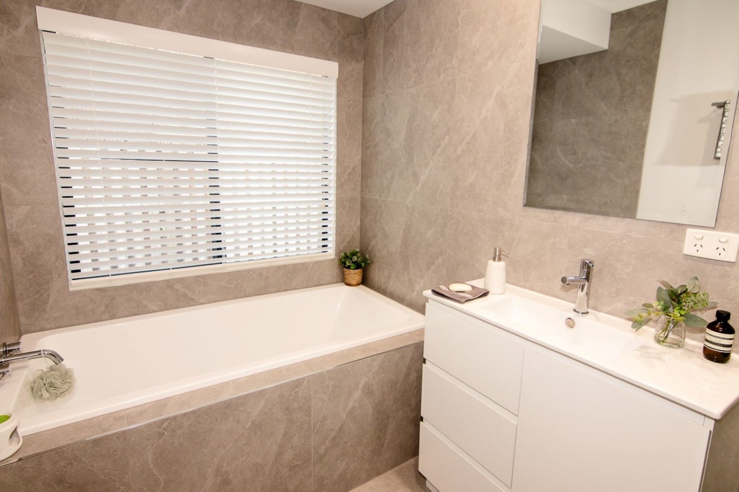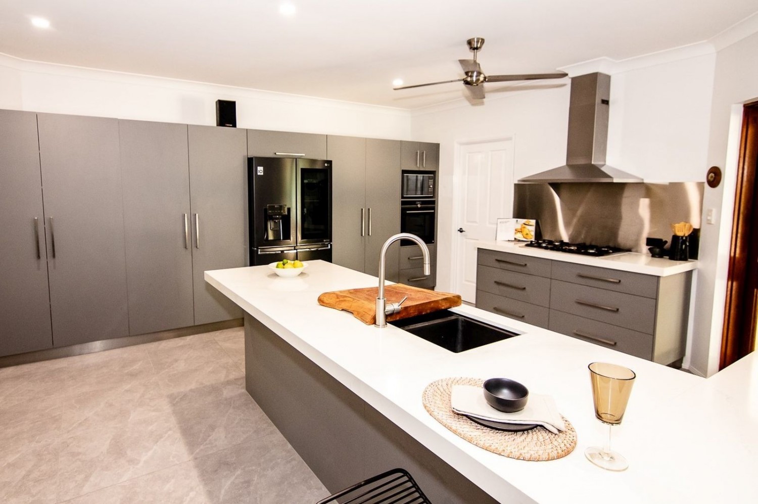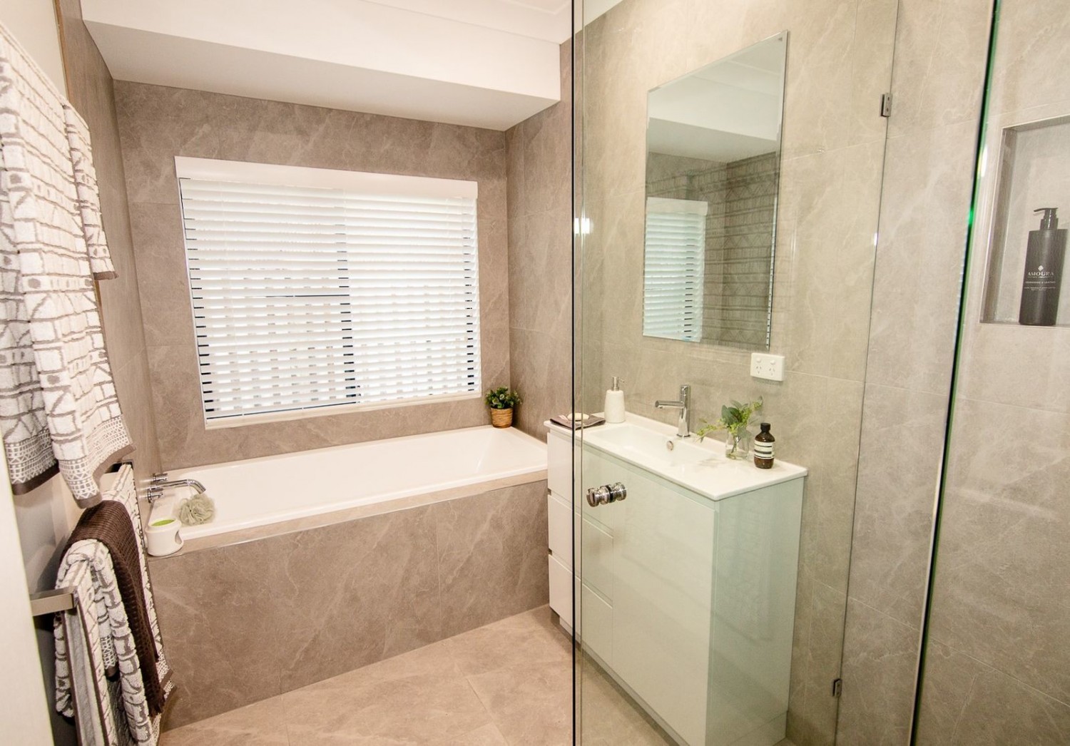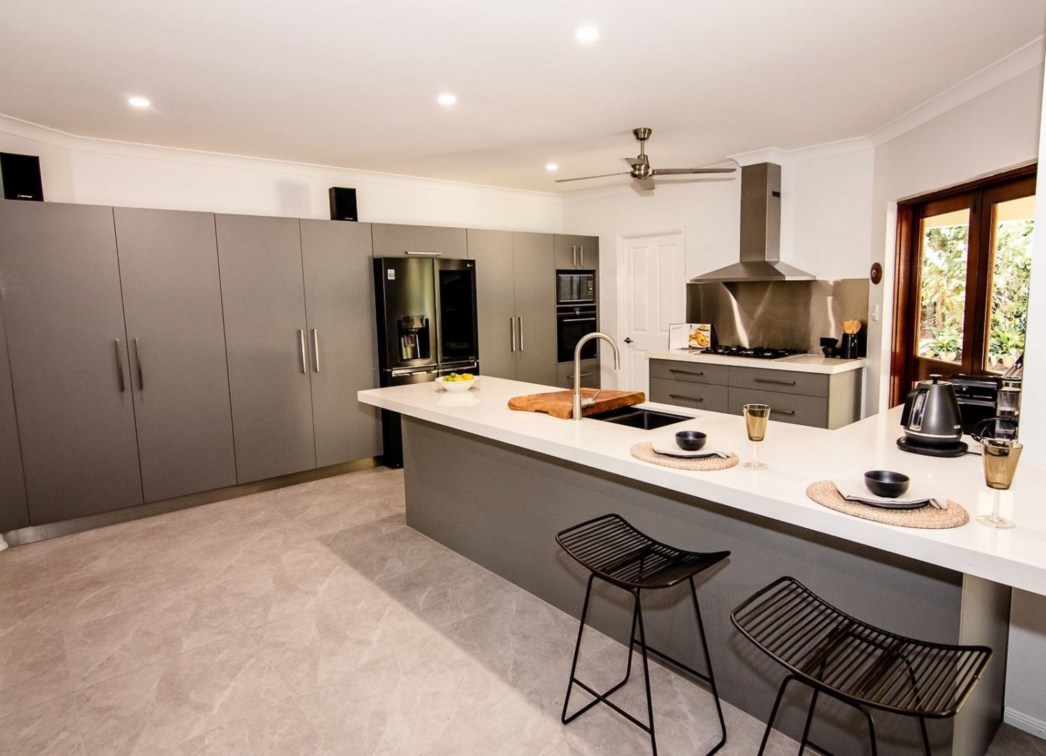 There's a large entry foyer/lounge space, with separate dining area, a massive second lounge/entertaining area, huge modern gourmet kitchen with ample cupboard and bench space. These areas are airconditioned and stylishly tiled and the sleek grey easy tiles continue throughout the house,.