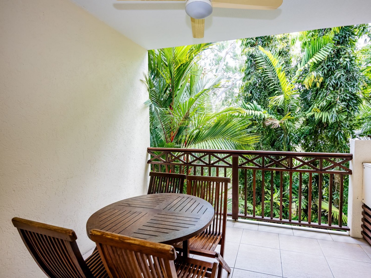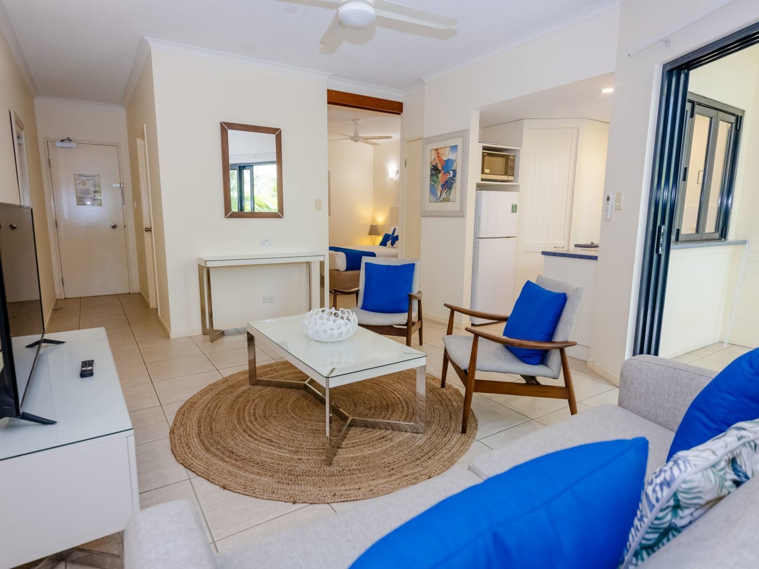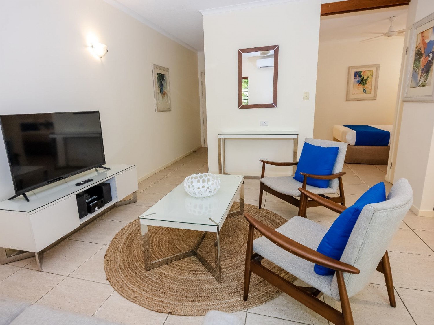 The comfortable apartment has a desirable and tranquil position within the resort, on the first floor overlooking a quiet reserve, with a balcony from which to relax and get a real feel of the tropics. Spot the butterflies and birdlife! Great use of space, lounge/dining, practical kitchen area. Looking very stylish after a refurbishment in November 2025. The queen bedroom has an ensuite shower room with additional entrance from the hall, convenient if you are coming from the beach or pool. For year-round comfort, there is split system airconditioning and overhead fans,