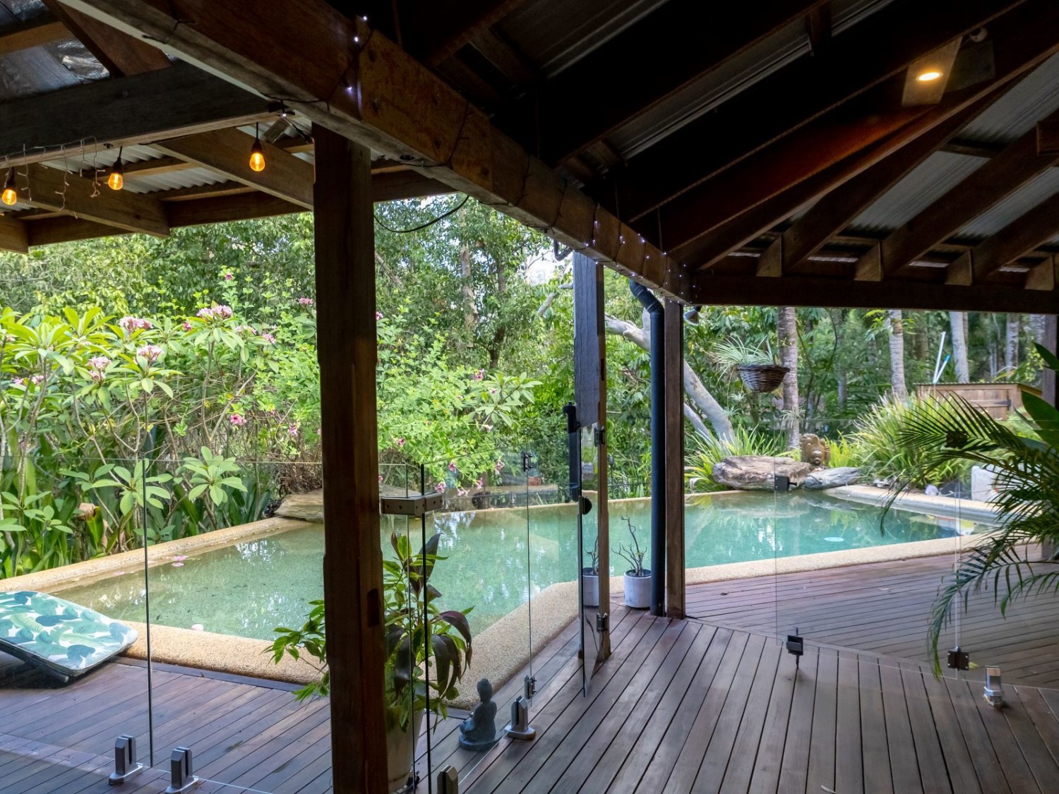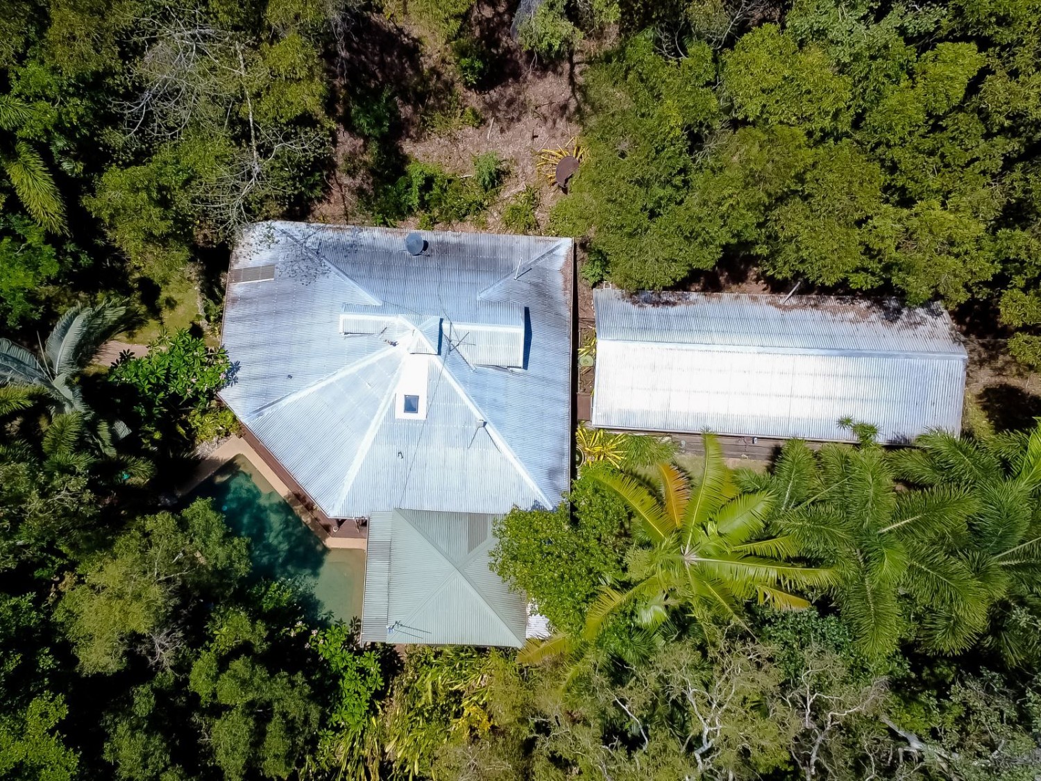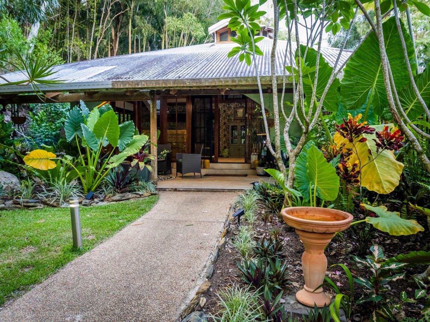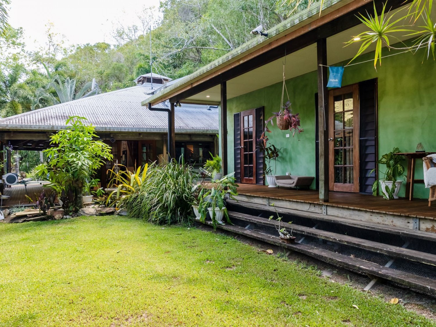 The main dwelling, set amidst lush tropical gardens, has soaring ceilings with substantial exposed timber beams, huge lounge/living area with airconditioning, mezzanine bedroom also with airconditioning, fabulous kitchen with island, an abundance of cupboards and bench space, and servery windows to the adjoining super-sized deck and swimming pool with a spa feature. On the ground level there is a stylish bathroom with standalone feature bath and spacious walk-in shower with stunning emerald tiles and dual basins; there is also a large separate airconditioned dressing or storage room. Overhead fans ensure year-round comfort. An adjoining dwelling is currently utilised as two offices, and a bedroom with ensuite and WIR. A separate building houses an indoor laundry, complete with ample cupboard and bench space and more storage rooms.