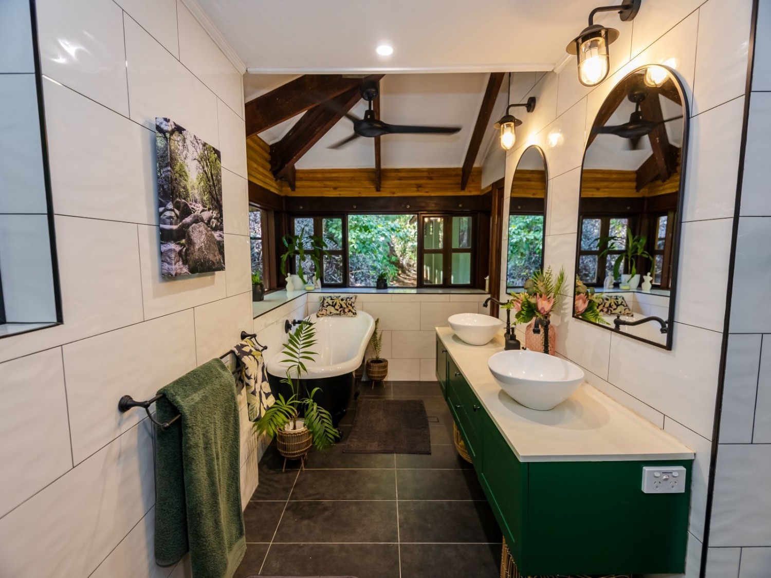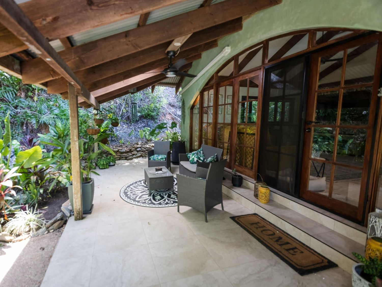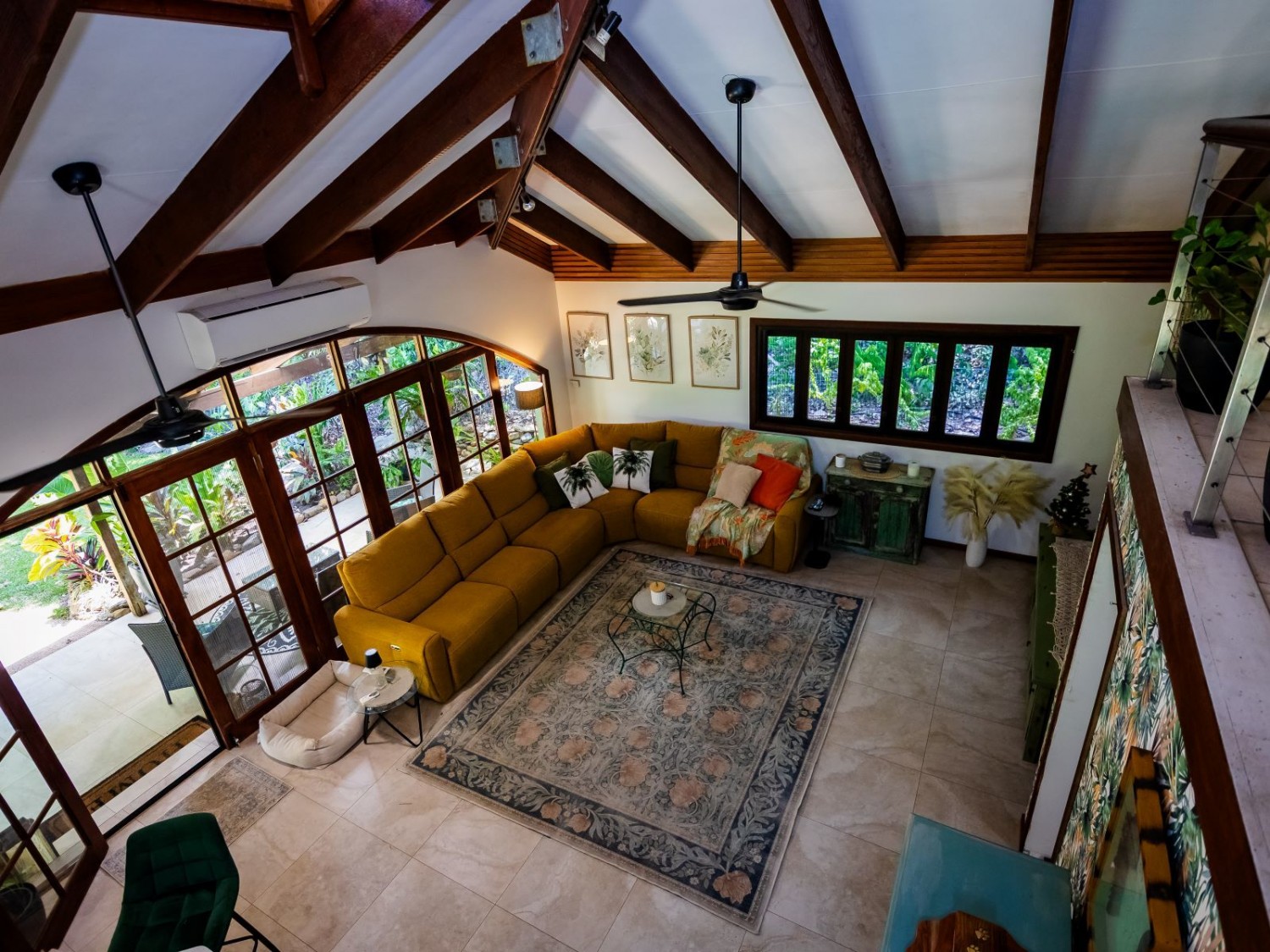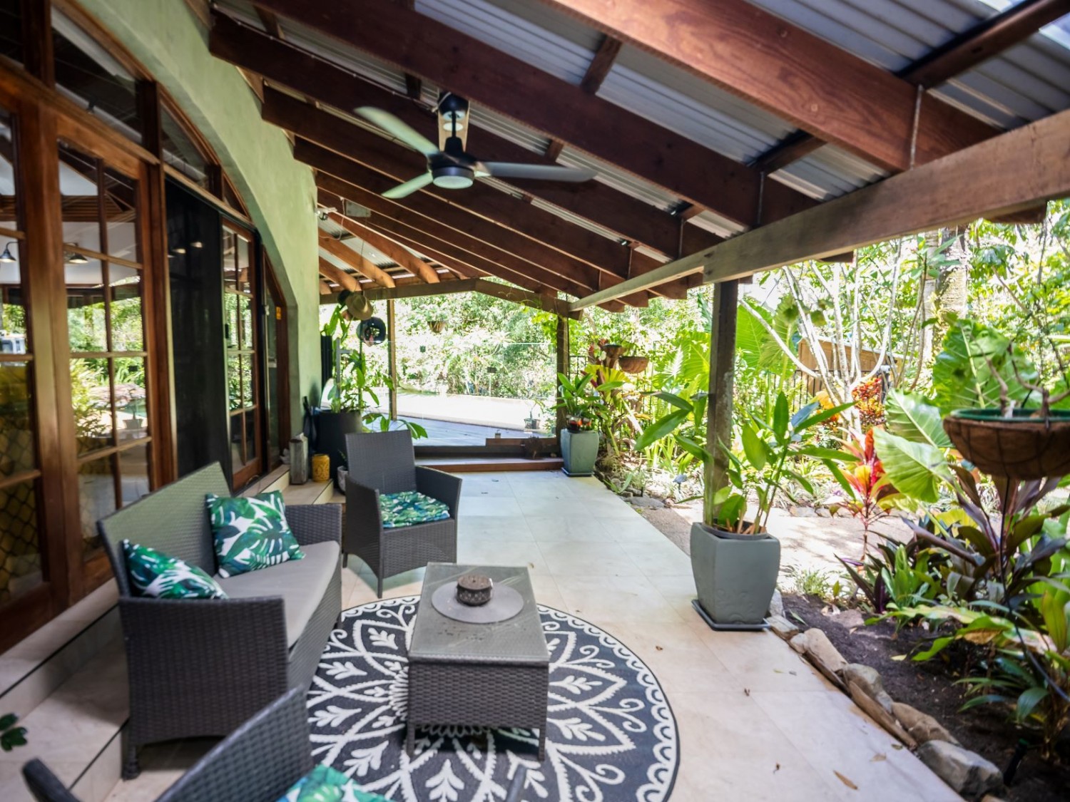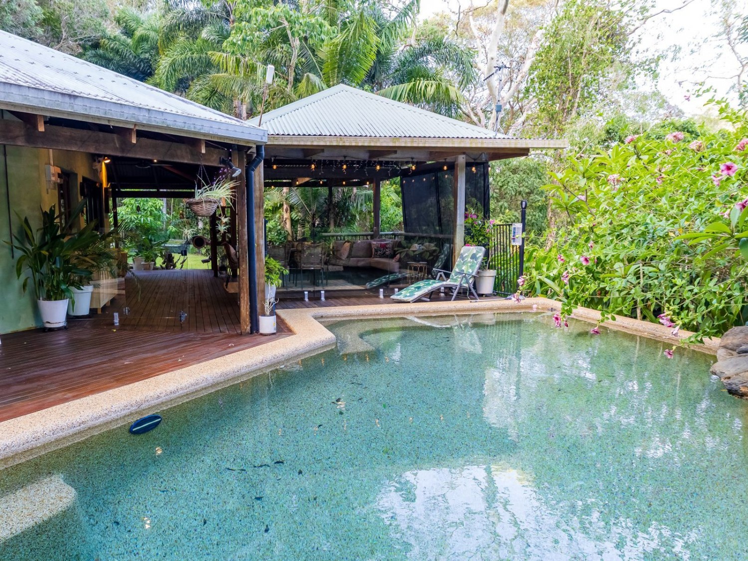 The main dwelling, set amidst lush tropical gardens, has soaring ceilings with substantial exposed timber beams, huge lounge/living area with airconditioning, mezzanine bedroom also with airconditioning, fabulous kitchen with island, an abundance of cupboards and bench space, and servery windows to the adjoining super-sized deck and swimming pool with a spa feature. On the ground level there is a stylish bathroom with standalone feature bath and spacious walk-in shower with stunning emerald tiles and dual basins; there is also a large separate airconditioned dressing or storage room. Overhead fans ensure year-round comfort. An adjoining dwelling is currently utilised as two offices, and a bedroom with ensuite and WIR. A separate building houses an indoor laundry, complete with ample cupboard and bench space and more storage rooms.