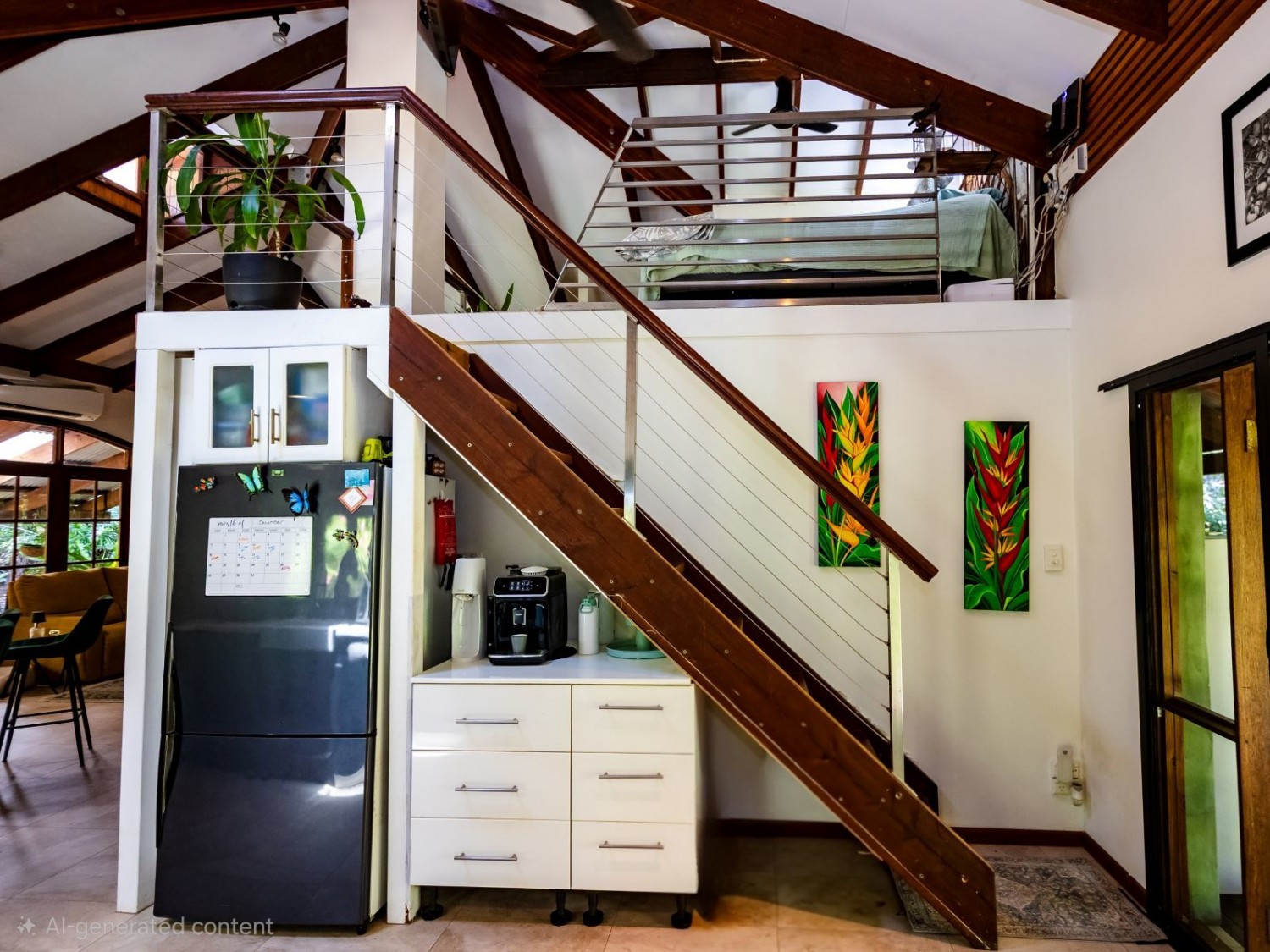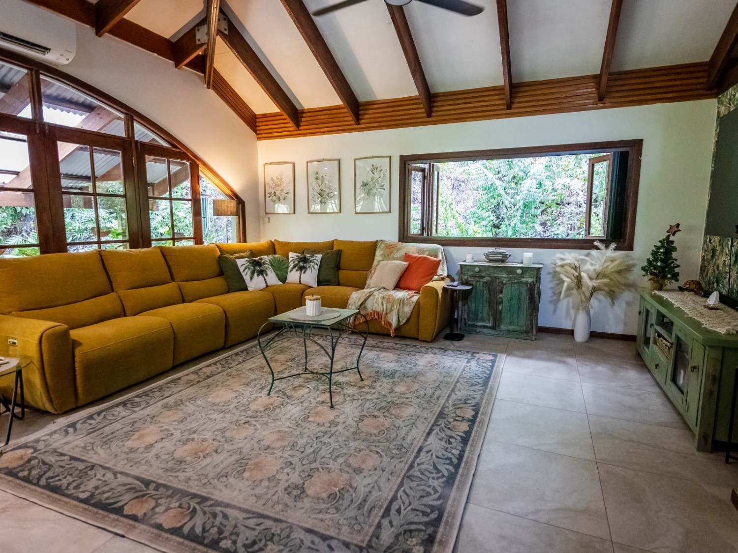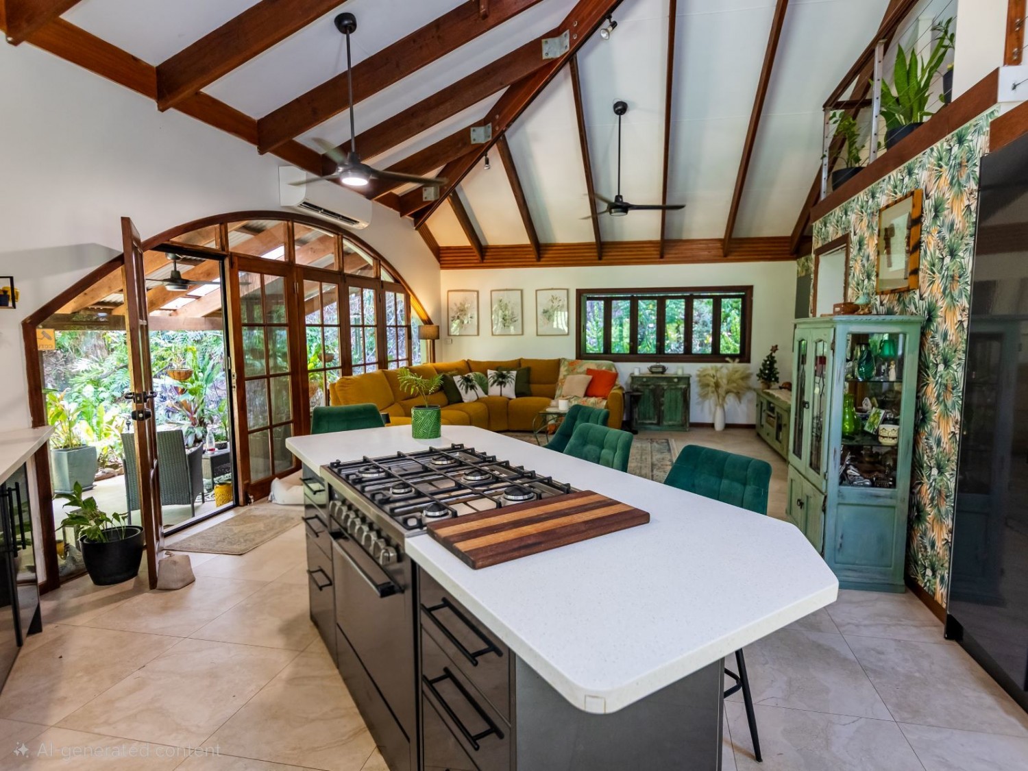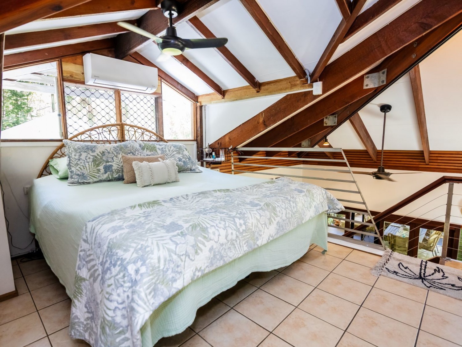 The main dwelling, set amidst lush tropical gardens, has soaring ceilings with substantial exposed timber beams, huge lounge/living area with airconditioning, mezzanine bedroom also with airconditioning, fabulous kitchen with island, an abundance of cupboards and bench space, and servery windows to the adjoining super-sized deck and swimming pool with a spa feature. On the ground level there is a stylish bathroom with standalone feature bath and spacious walk-in shower with stunning emerald tiles and dual basins; there is also a large separate airconditioned dressing or storage room. Overhead fans ensure year-round comfort. An adjoining dwelling is currently utilised as two offices, and a bedroom with ensuite and WIR. A separate building houses an indoor laundry, complete with ample cupboard and bench space and more storage rooms.