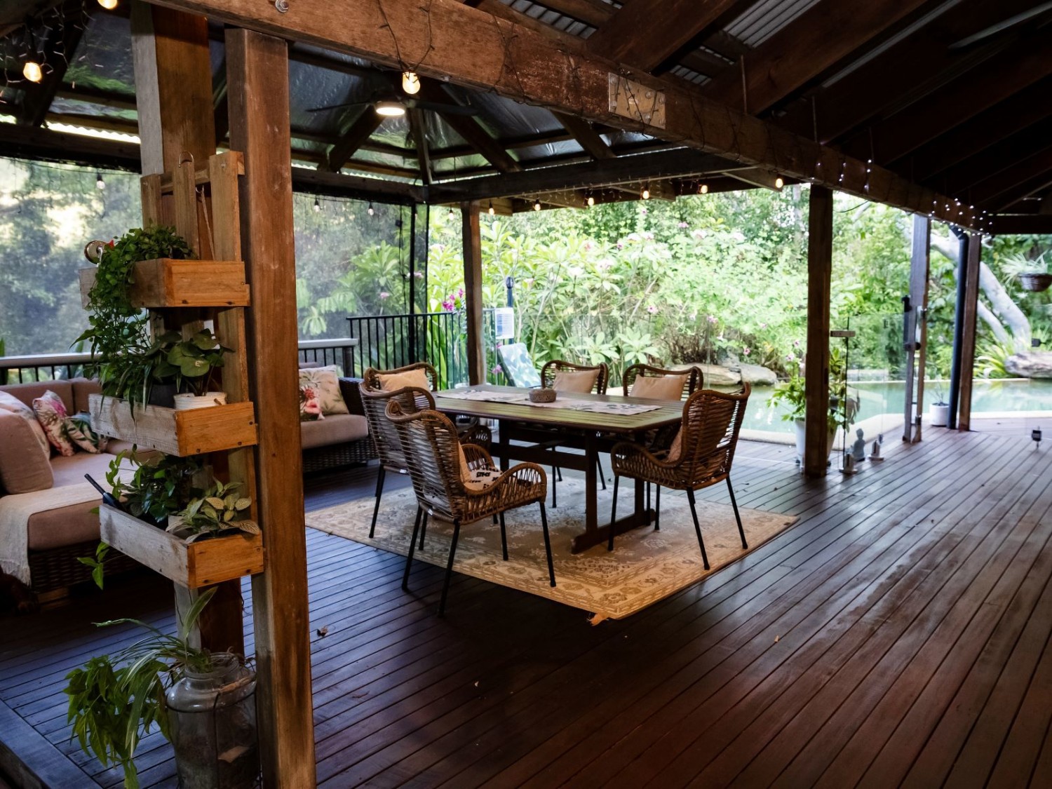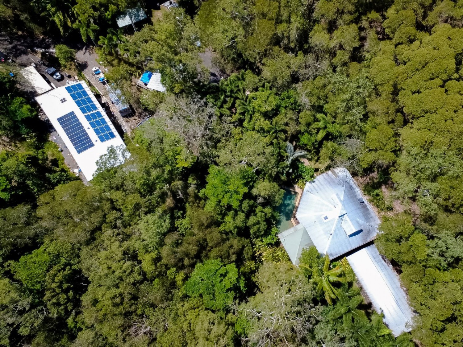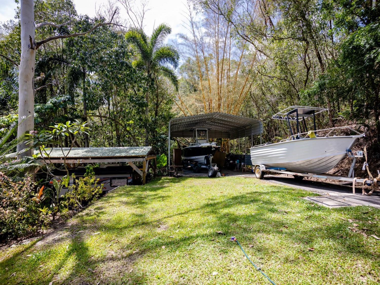 There is also a large custom-built shed, 20m x 9m, with ceiling fans, mezzanine floor and verandah to the front. The solar panels on this also supply power to the house. There are other protective structures for a caravan and boat, so you have the ideal base from which to enjoy all that tropical living has to offer.